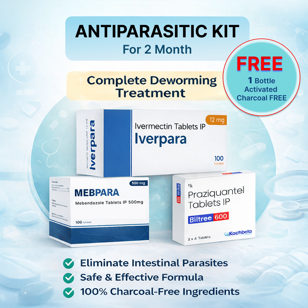 Iverpara 12 mg – 100 pills Mebpara 100mg – 50 pills Praziquntal 600mg – 50 pills 1 bottle activated charcoal free.